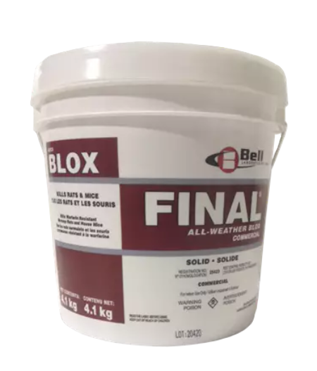FINAL BLOX contains Brodifacoum, a powerful single-feed anticoagulant effective against rats and mice, including warfarin-resistant Norway rats and house mice. A lethal dose may be consumed in one feeding, with results typically seen within 4–5 days.